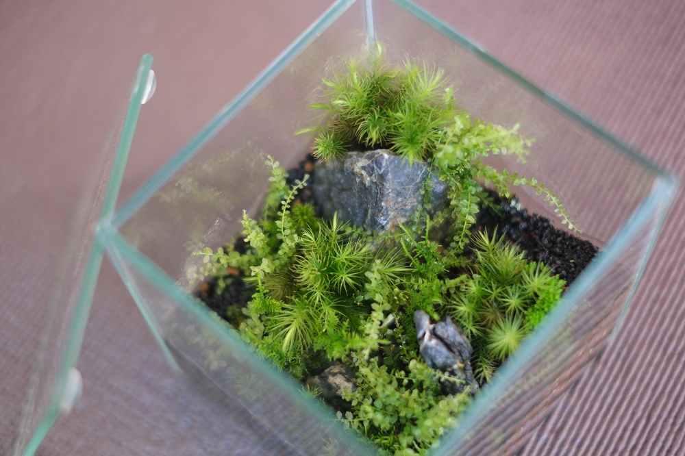 ゆっくりと苔も成長していくので少しずつ容器の中で変化を楽しむ事ができます。